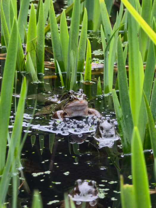 Common frog in the infinity pond, with cinquefoil and filamentous algae. May 24th 2024.